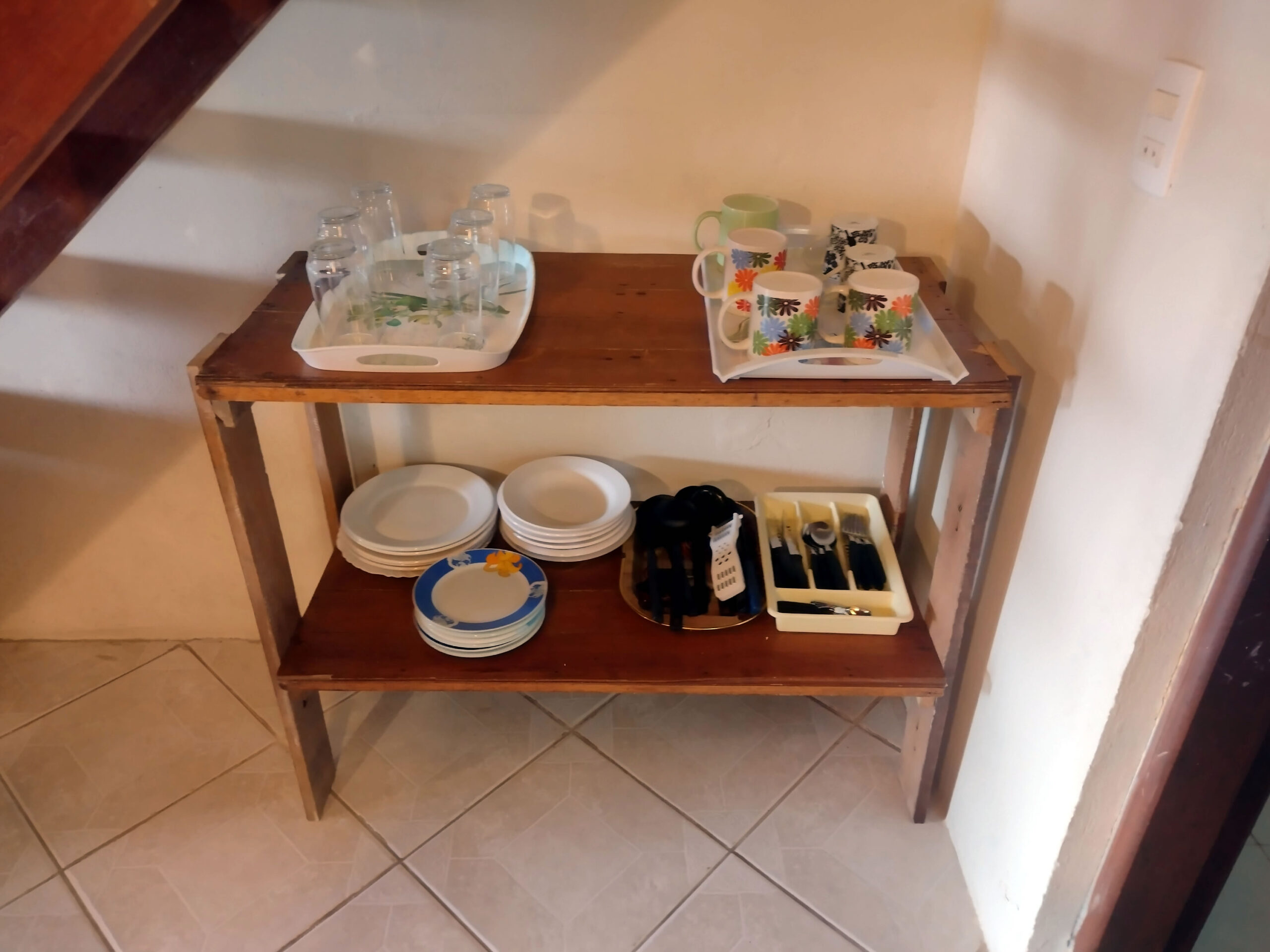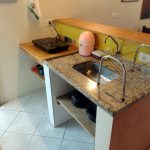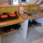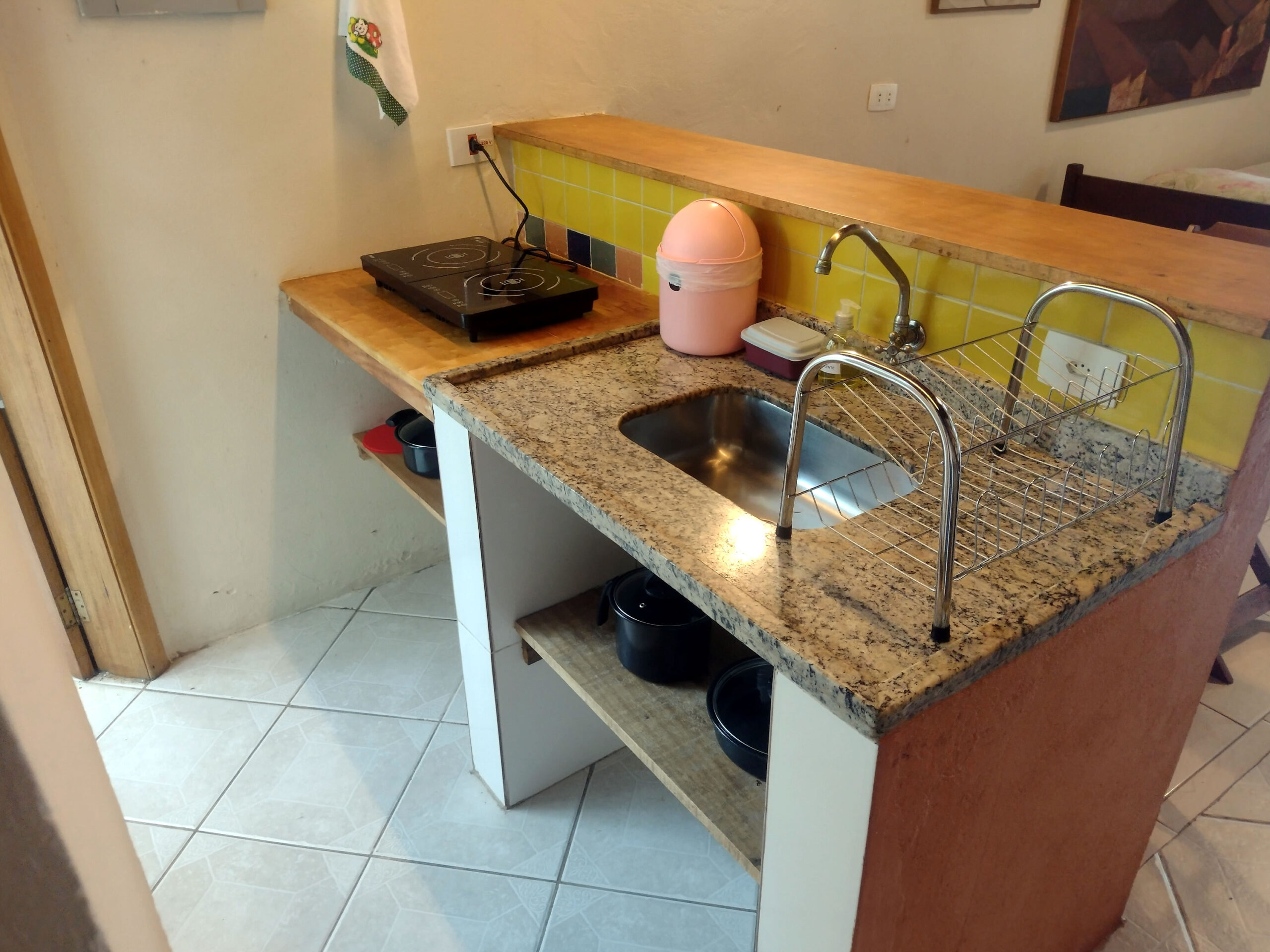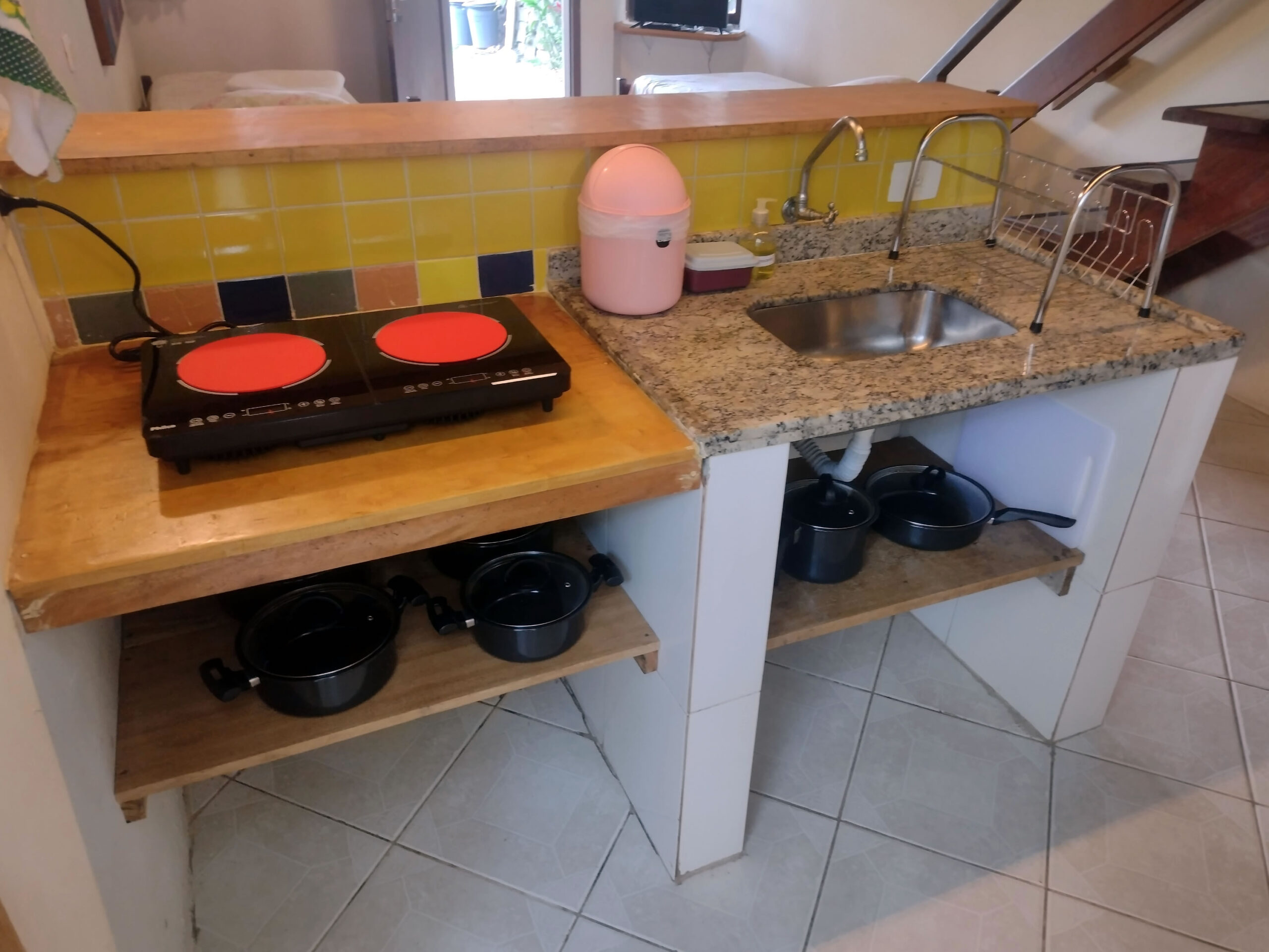 - cozinha equipada com cooktop, geladeira, panelas e acessórios
